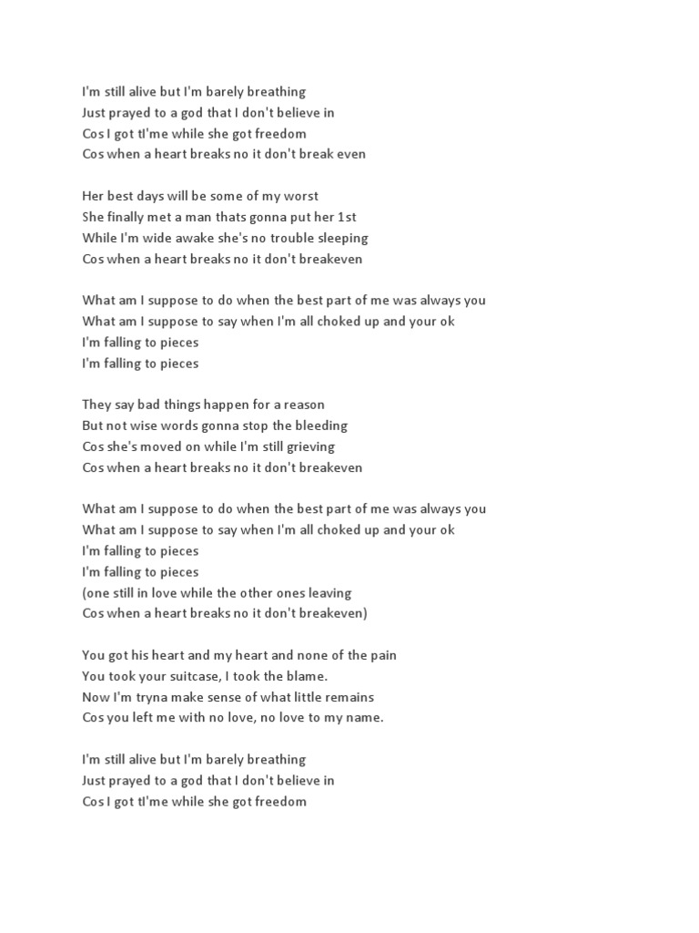 I'm still alive but i'm barely breathing just prayed to a god that i don't believe in 'cause i got time while she got freedom 'cause when a heart breaks no it don't breakeven her best days will be some of my worst she finally met a man who's gonna put her first while i'm. Just prayed to a god that i don't believe in 방금 믿지도 않는 신에게 기도를 했지. Just prayin' to a god that i don't believe in. Gm f bb cm7 i'm still alive but i'm barely breathing. I'm still alive but i'm barely breathing / just prayin' to a god that i. #drunk #drinking #dope #vh1 #barely famous. Now i'm try'na make sense of what little remains ooh. What am i suppose to say when i'm all choked up and you're ok 난 목이 완전 막혀있고 넌 괜찮은데, 무슨 말을 해야겠어. Cos when a heart breaks no it don't breakeven. I'm alive i'm alive i'm alive i'm alive. Now it's more like i've already drowned and i'm sitting at the bottom of the ocean with a weight on my feet and i'm surrounded by sharks. You fell for them and they broke your heart but you still have the right to shed a few tears over them. I honestly can't remember how long it's been since i made it through a full day without crying.